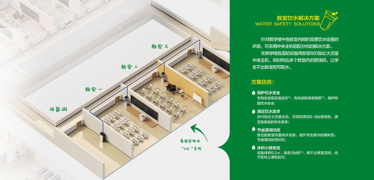 一直以来,孩子们在校的饮水问题一直备受学校、家长的关注;我公司结合行业标准,结合幼儿园、中小学、各大学院校等不同的用水场景需求,提供各种设备不同的解决方案; 根据教学楼各层教室内同时需要饮水设备环境, 在学校固定的设备间安装一台大型直饮水主机,通过不锈钢管道/PPR管/净水专用管,同时供应多个教室内的管线饮水机,让学生不出教室即可取水。