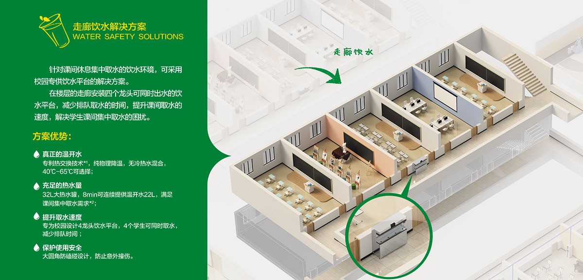 优势:①温开水出水 【采用热交换系统,冷热转换快,节能更健康】;②全管路高温杀菌-确保出水;③自主排空(专为学校假期设计)